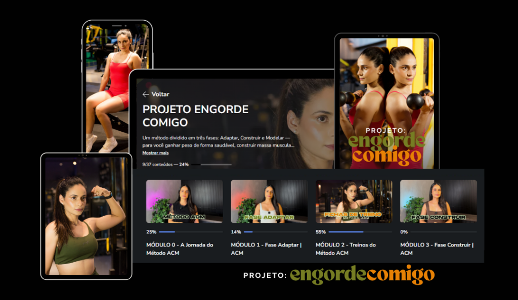 O Projeto Engorde Comigo é o caminho completo pra você sair de onde está e construir o corpo que quer ver no espelho, com glúteo, perna, curvas e proporção.